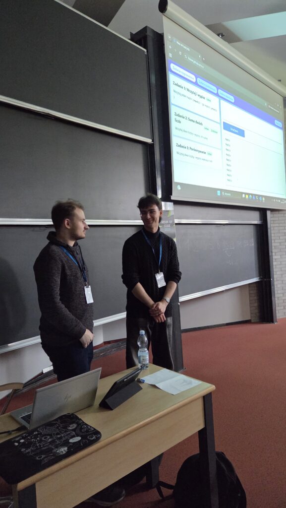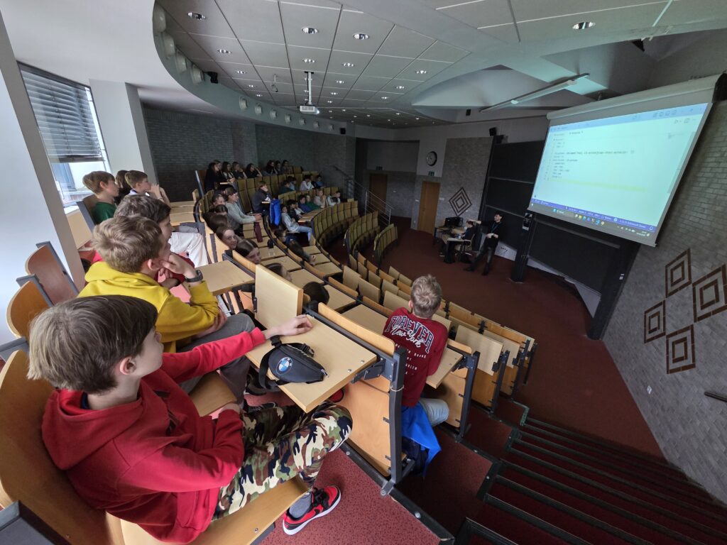Podczas wizyty uczniowie mieli okazję uczestniczyć w ciekawym wykładzie wprowadzającym do programowania w języku Python. Następnie wzięli udział w warsztatach praktycznych, podczas których każdy pracował przy własnym stanowisku komputerowym, rozwiązując zadania programistyczne pod czujnym okiem studentów.